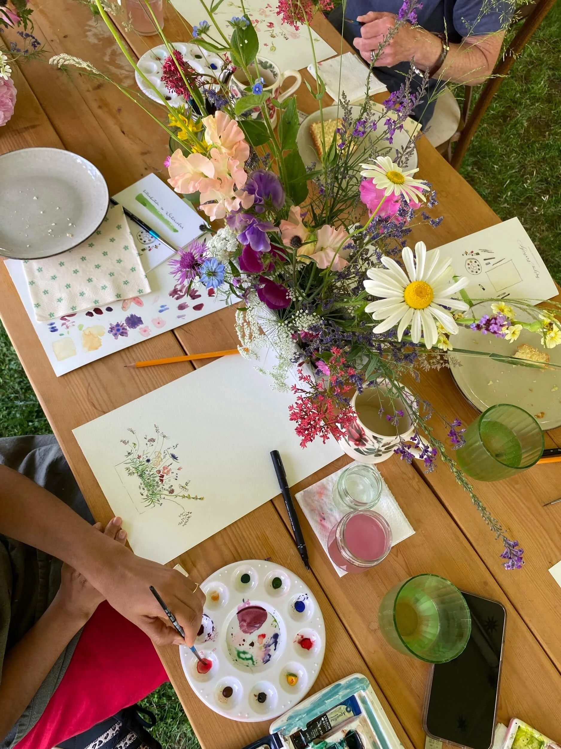 Caroline of Hayloft Floral and I created our flowers and watercolour workshops in summer 2024 after realising how aligned our feelings were about our creative passions, and how much we wanted to share them with others. We had both been running workshops separately, but collaborating to offer a day that celebrates British seasonal flowers felt like the perfect fit.