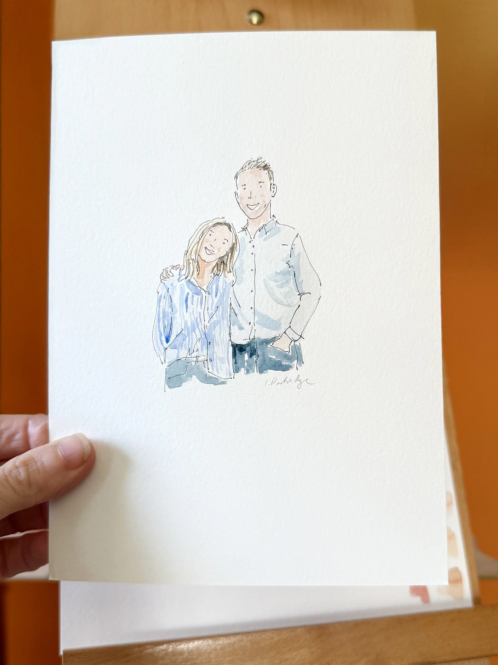 Live illustrated portraits that guests can take away. Quick watercolour illustrations for guests to take home on the day. Each portrait takes 5–10 minutes, creating a personal, stylish memento and a wonderful talking point during your event.